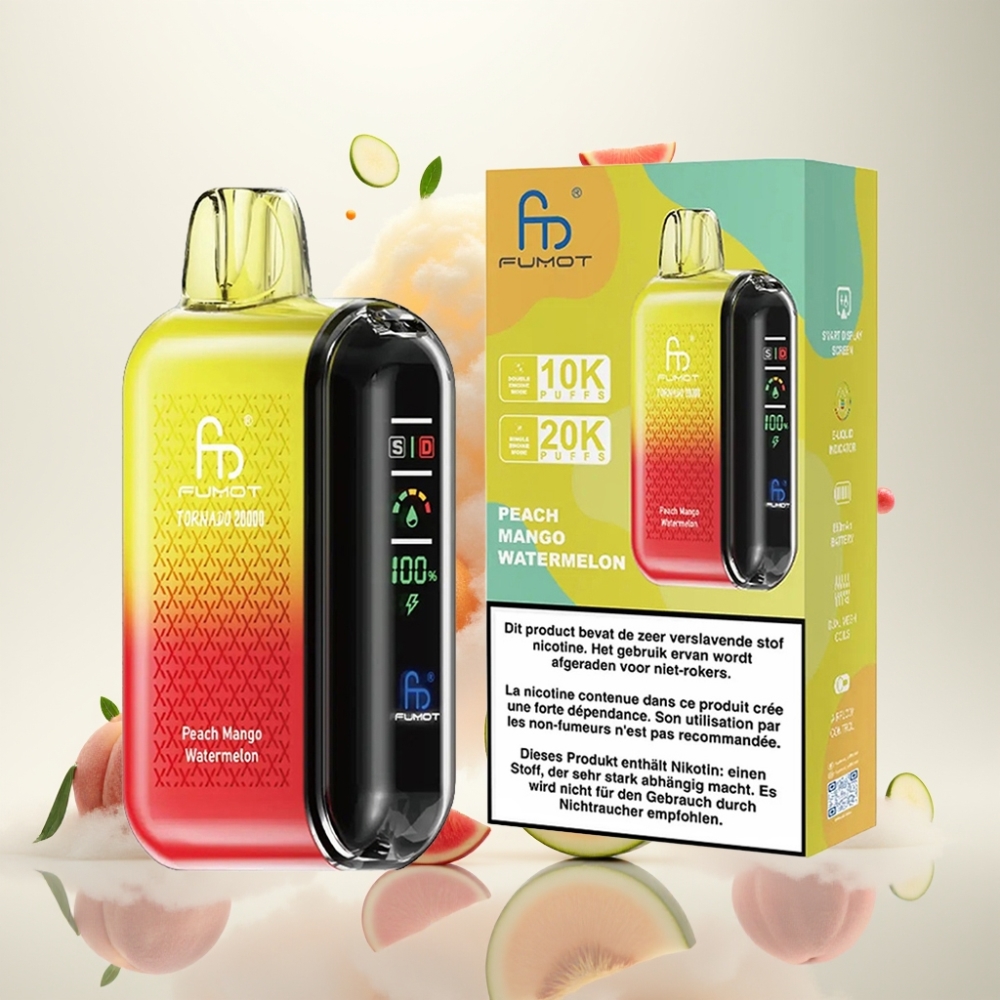 فوموت تورنادو Fumot Tornado 20000 نفخة خوخ مانجو بطيخ - شاشة ذكية، 20مل، 2% نيكوتين